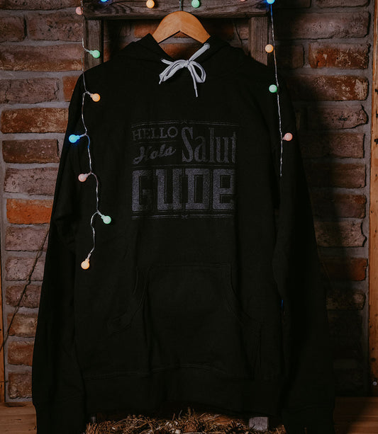 Hello, Hola, Salut, GUDE - Hoodie, schwarz auf schwarz